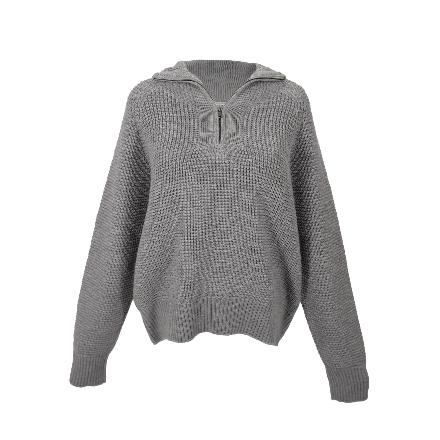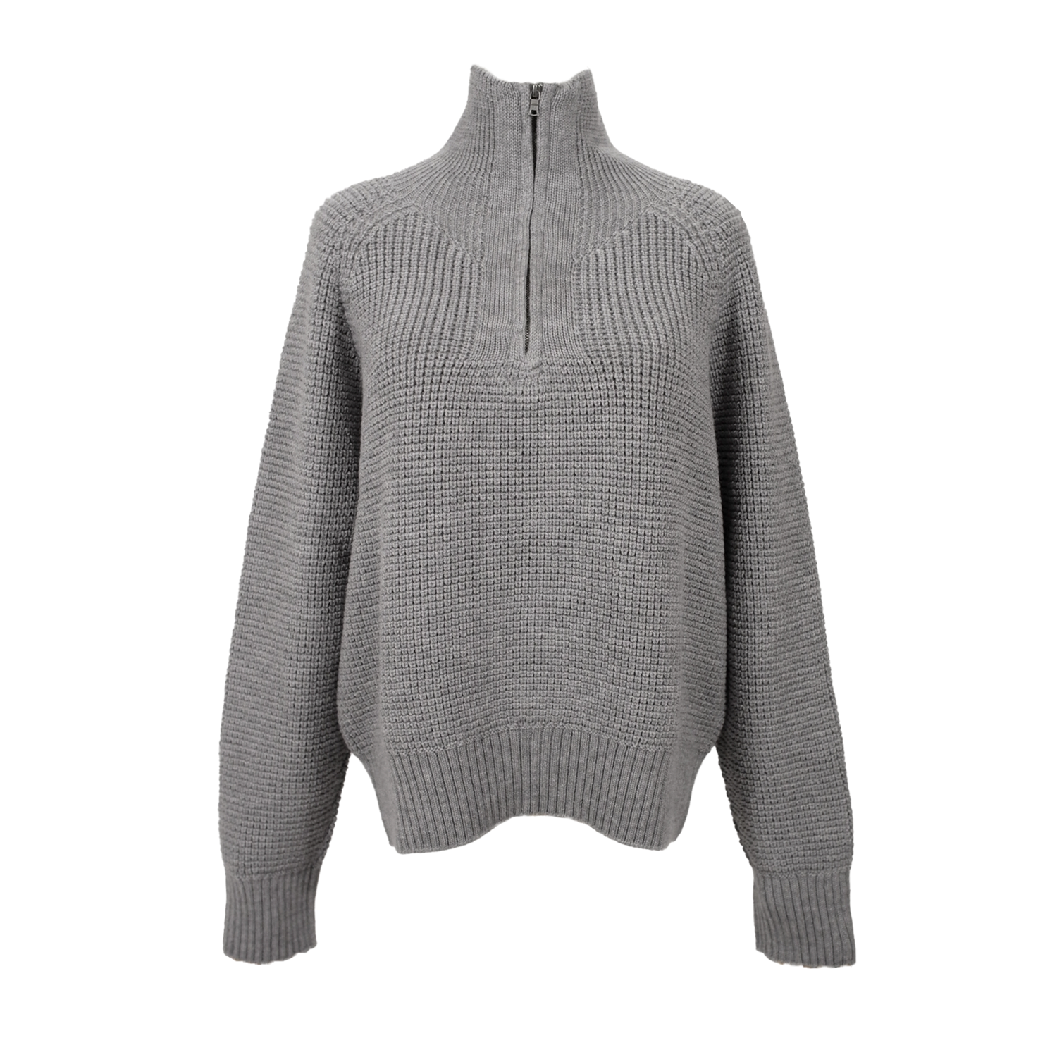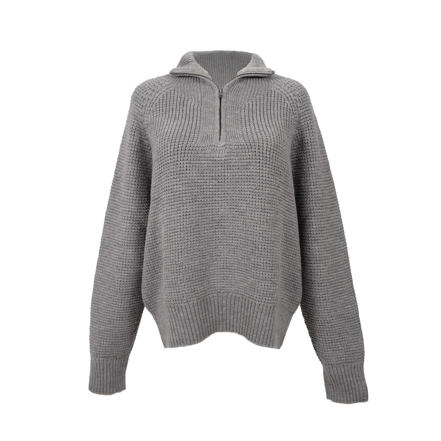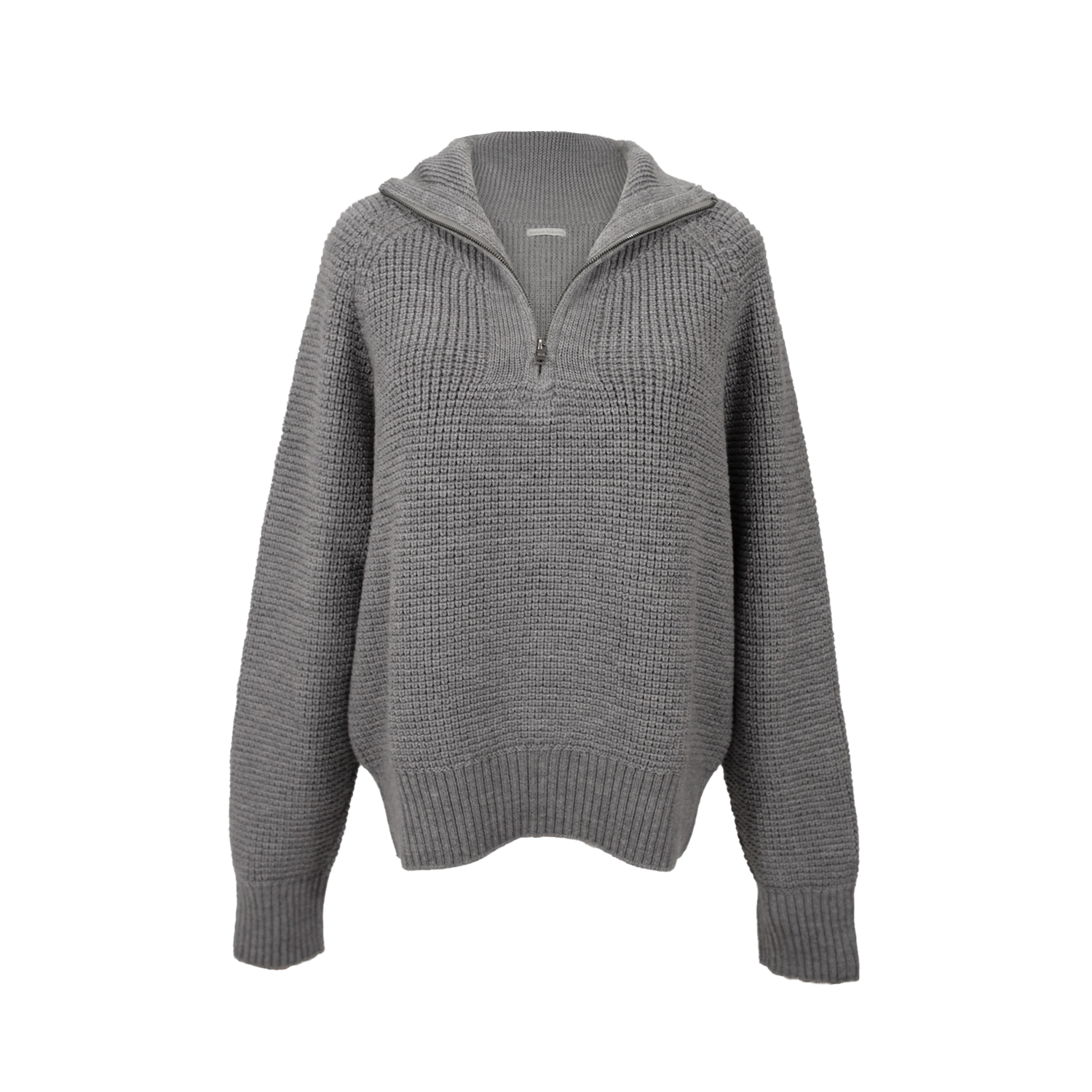 - Mid-heavyweight popcorn knit with rib trim and quarter zip collar detail